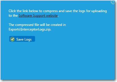 8. To save the log files in a ZIP file, so that it could perhaps be sent to product support personnel, click Save Logs . You are prompted to confirm the creation of a ZIP file which will contain a set of .csv log files.
