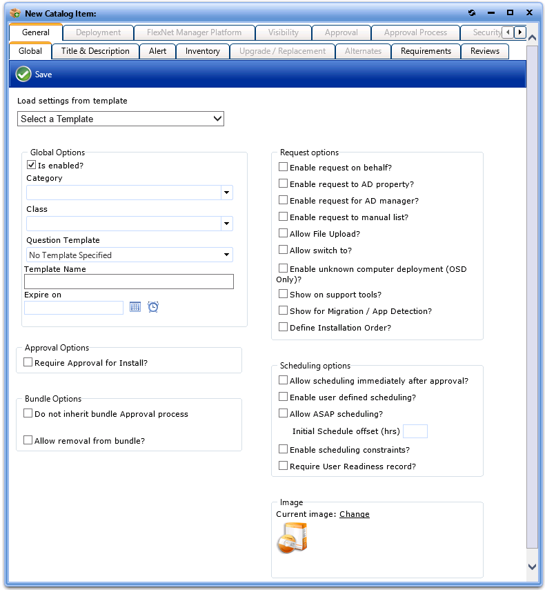 - Under Create New Catalog Item , click on New Software Catalog Item . The General > Global tab of the New Catalog Item Properties dialog box opens.