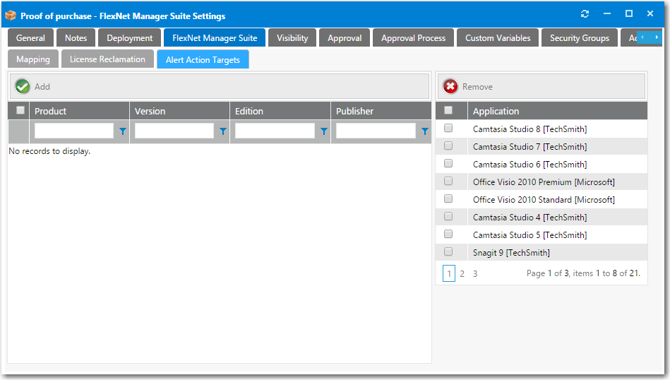 When informed by FlexNet Manager Suite that there are no remaining licenses for an application, administrators can choose to trigger a proof of purchase alert by modifying the existing Proof of purchase Alert Action catalog item to target the identified application.