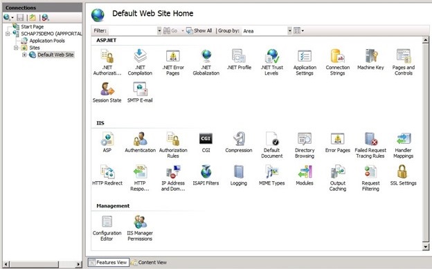 - Select Default Web Site in the tree. The Default Web Site Home view opens.